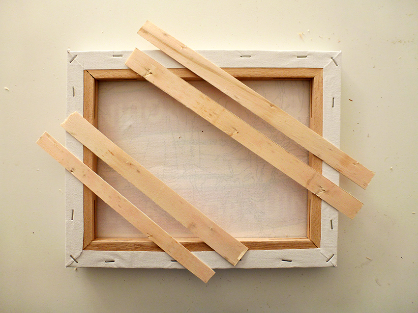 Forramos la base, en este caso un lienzo "pinta y colorea", encolando los listones. Lo bueno de este tipo de madera es que se puede cortar con tijeras o cútter :)